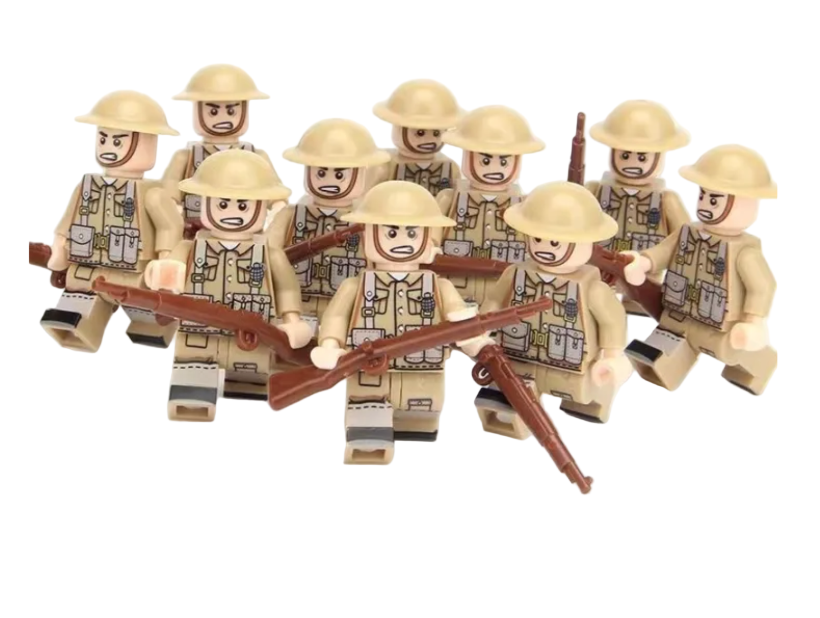 March into history with the Minibrikz WWII British Desert Infantry Squad, featuring 24 tan-uniformed riflemen inspired by the Commonwealth forces of the North African campaign. Outfitted with Brodie-style helmets and detailed gear prints, each soldier carries a brown rifle and stands ready on an included display baseplate.